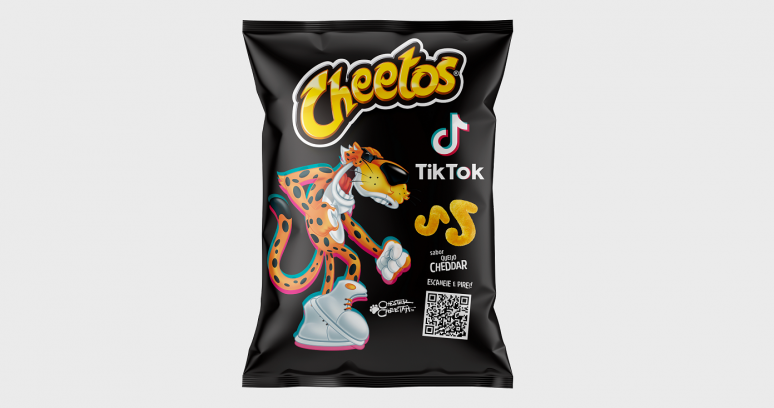 Cheetos e TikTok se uniram para mostrar uma embalagem especial do snack, que, além de trazer o logo da plataforma de vídeos curtos, também apresenta QR Codes no pacote para direcionar a desafios no aplicativo. A parceria foi anunciada por Chester Cheetah, o mascote da marca, e teve a campanha idealizada pela agência Galeria.