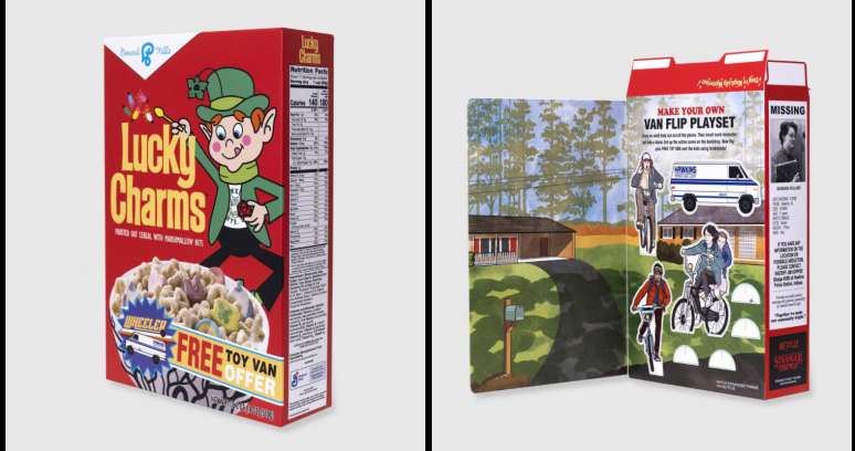 Nas edições limitadas de de Lucky Charms, Cinnamon Toast Crunch e Cheerios, a General Mills recuperou imagens da época e uniu a referências de “Stranger Things”, em combinações até mesmo surrais, com montagens com frases ao contrário, ilustrações de cabeça para baixo (brincando com o mundo invertido) e desenhos dos personagens da série.