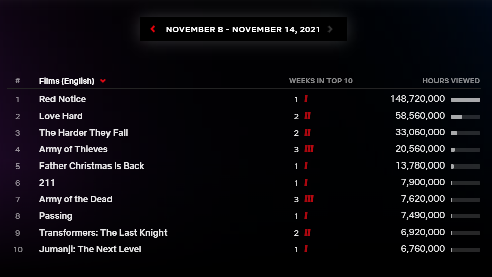 Então, nessa espécie de hub semanal, a lista será atualizada às terças-feiras com os seus principais filmes e séries nas seguintes categorias: Filmes (inglês), Filmes (não inglês), TV (inglês) e TV (não inglês), exibindo a quantidade de horas que cada um deles foi assistido.