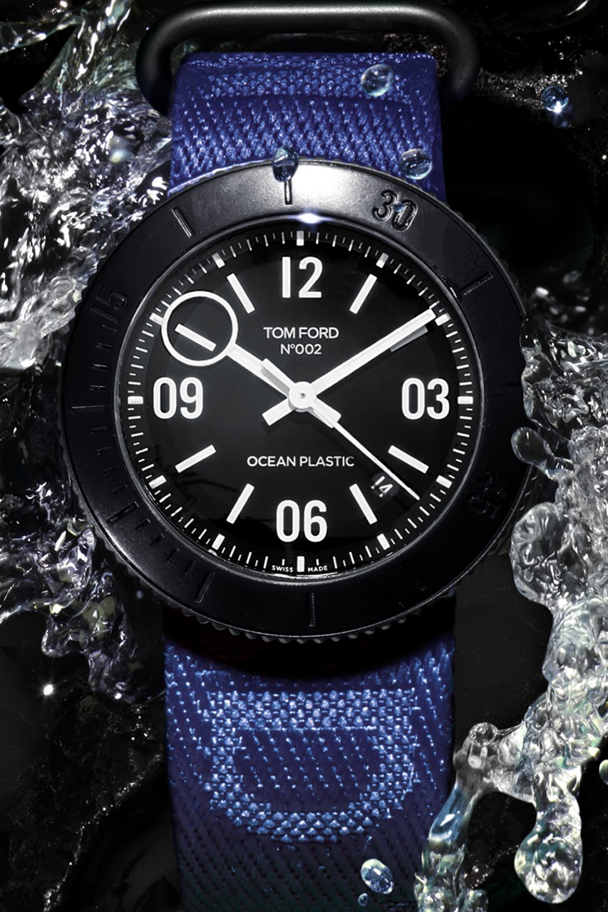 O mais recente lançamento de Tom Ford para a linha Ocean Plastic é um relógio automático, que é o primeiro do mundo feito com resíduos de plásticos do oceano.