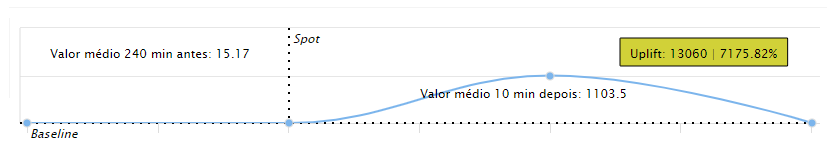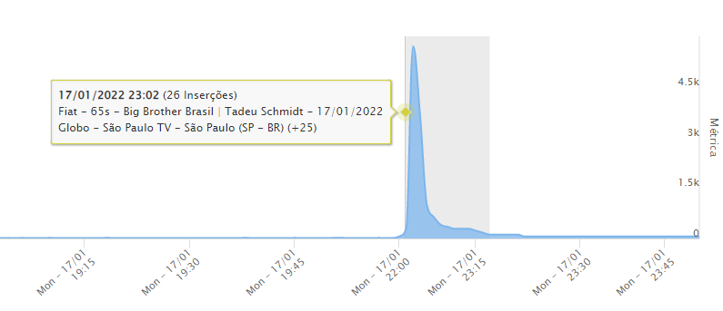 Ao avaliar os dados (abaixo), é possível observar que a Fiat atingiu um uplift de buscas de 7175% nos 10 minutos após a exibição do merchan no BBB22, atingindo 13 mil buscas adicionais para a marca só no Google.