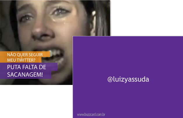 Xingar muito no Twitter e procurar seu chip aos berros também pode ser uma diversão fora da web. A Digipix disponibilizou os Buzzcards, fotocartões com mensagens do que virou hit na internê. Você customiza o Buzzcard na web e, por R$ 9,90, recebe em casa. No exemplo do post, eu escolhi a própria autora da frase para ilustrar um cartão com o meu Twitter: