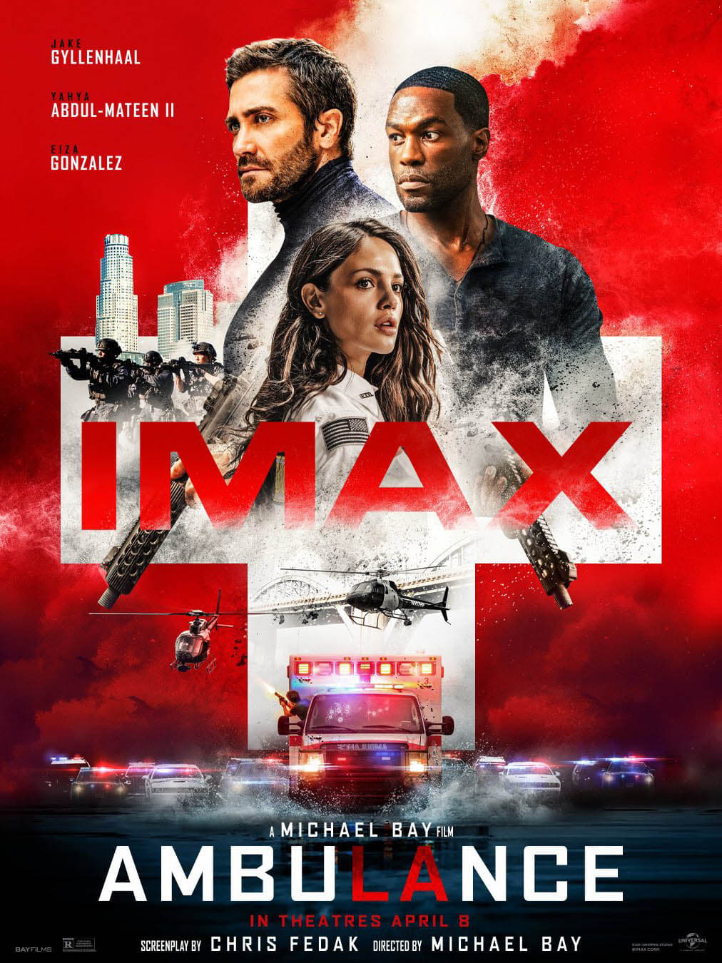 De novo, se trata de um filme de Michael Bay, então tal provocação está distante da melancolia e se assume no fluxo da ação, que dessa vez faz valer a reputação de “imparável” de seu realizador. Já virou uma piada recorrente quando se fala da produção, mas não custa lembrar de novo que “Ambulância” refaz a história de um thriller dinamarquês de mesmo nome de 2005 pela inversão de polos, deixando de lado a proposta “contida” da premissa de um filme de ação de baixo orçamento (e focado no interior do veículo) para se render a toda a extravagância do provável orçamento de mais de 200 milhões de dólares. Não é uma jogada de capricho, porém: o longa de fato não se interessa tanto pelas dinâmicas de tensão que surgem entre a socorrista vivida por Eiza González e os assaltantes de Jake Gyllenhaal e Yahya Abdul-Mateen II, preferindo enquadrá-las dentro do gato e rato que a polícia nutre para capturar os bandidos.