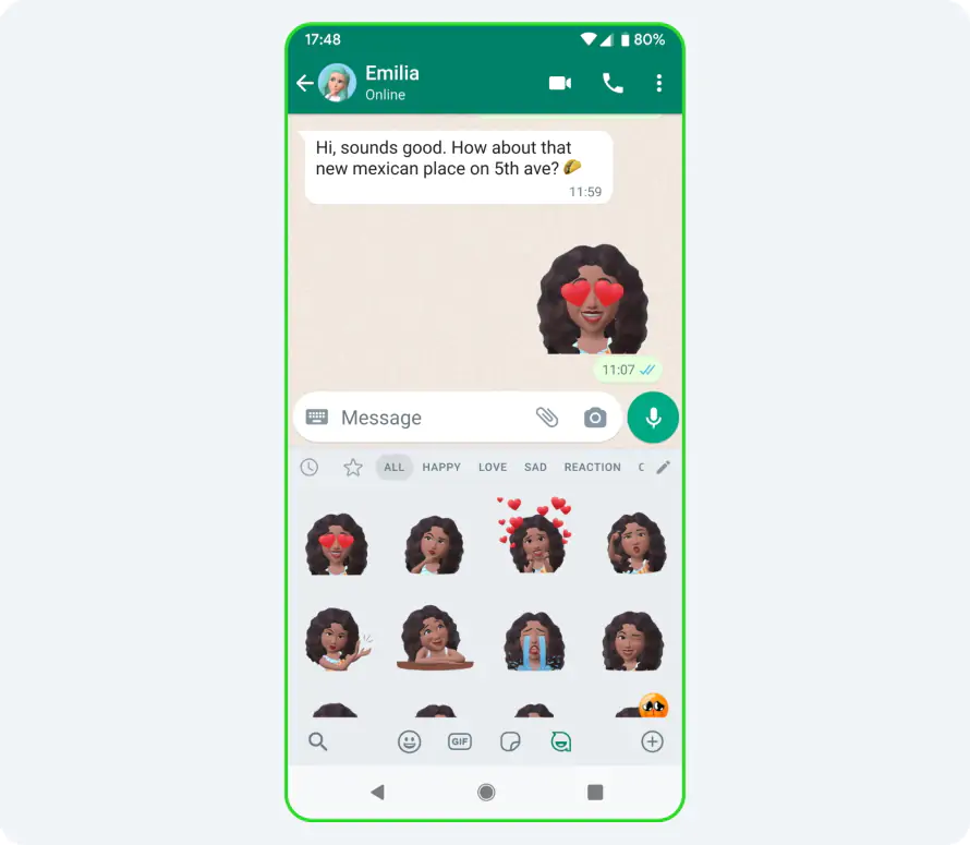 Depois de criado, você pode utilizar o avatar como foto do perfil ou transformá-lo em um dos 36 adesivos que refletem várias emoções e ações diferentes.