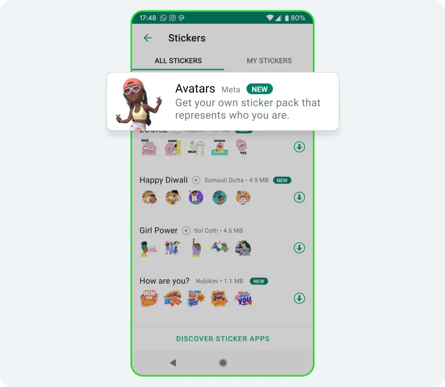 O avatar pode ser utilizado como foto do perfil ou como uma das 36 figurinhas que representam diferentes emoções