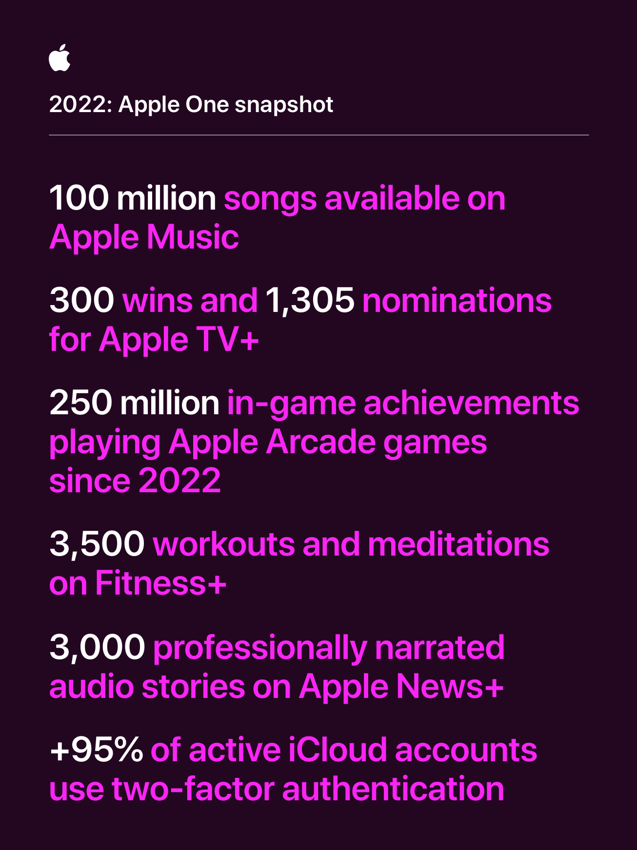 Segundo os números revelados, a Apple conta com mais de 900 milhões de assinaturas distribuídas entre os vários serviços ofertados pela empresa. Desde 2008, cerca de 320 bilhões de dólares foram pagos a desenvolvedores que venderam produtos e serviços digitais através do ecossistema Apple.