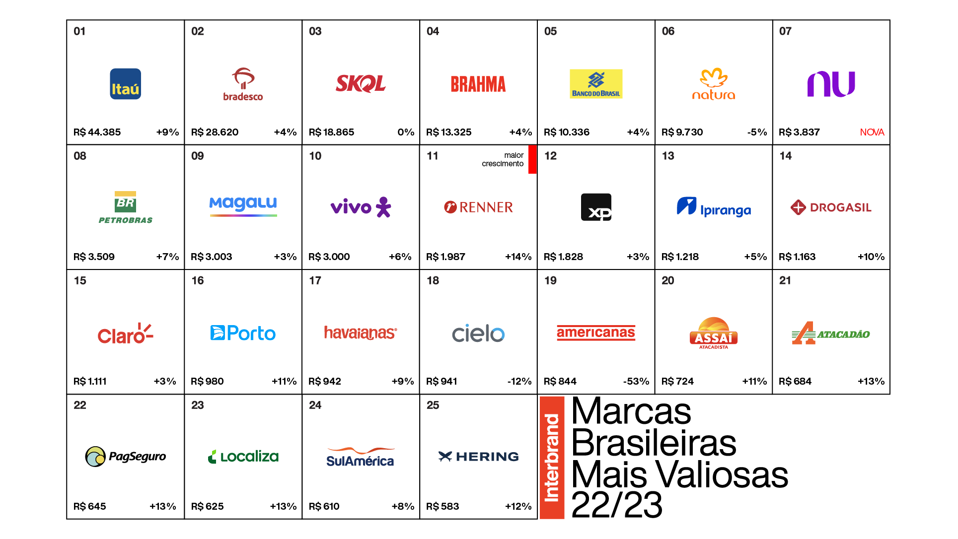 Fora o banco digital, as marcas que mais cresceram em valor em relação ao ano anterior foram Renner, Localiza, PagSeguro, Atacadão, Hering, Assaí, Porto Seguro e Drogasil. Quem mais perdeu valor de marca foi a Americanas, que caiu da 10ª para a 19ª posição, afetada pelo escândalo contábil descoberto em janeiro.