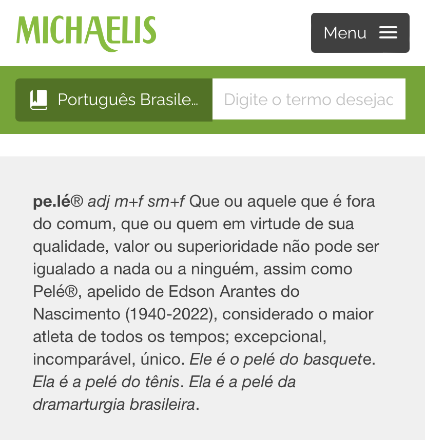 • Definição destaca excepcionalidade: Pelé virou sinônimo de singularidade e incomparabilidade, com exemplos ilustrativos da aplicação do termo em diferentes contextos. Novo verbete já está disponível na versão digital, em breve nas edições impressas: