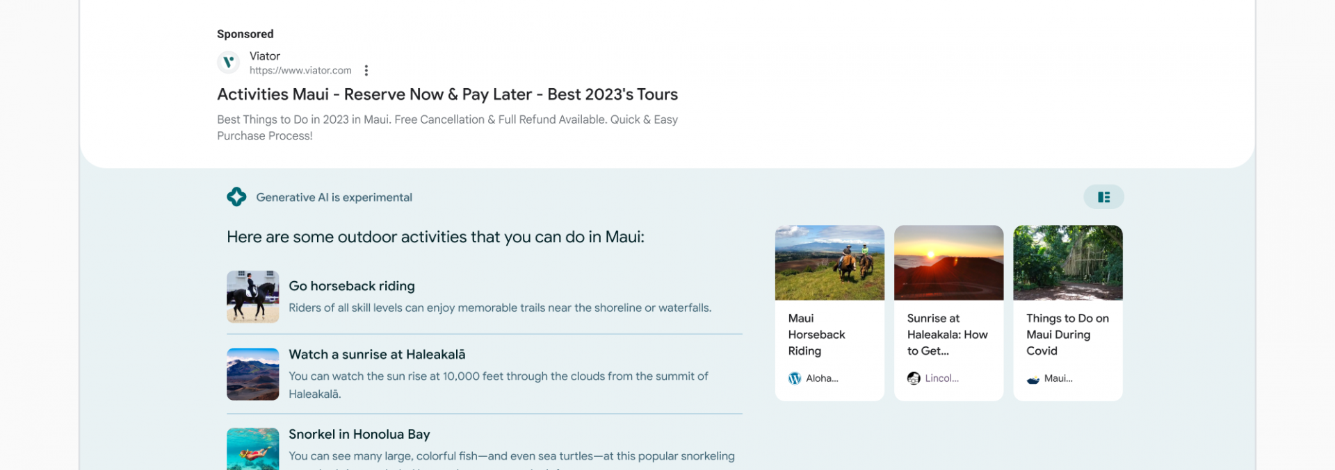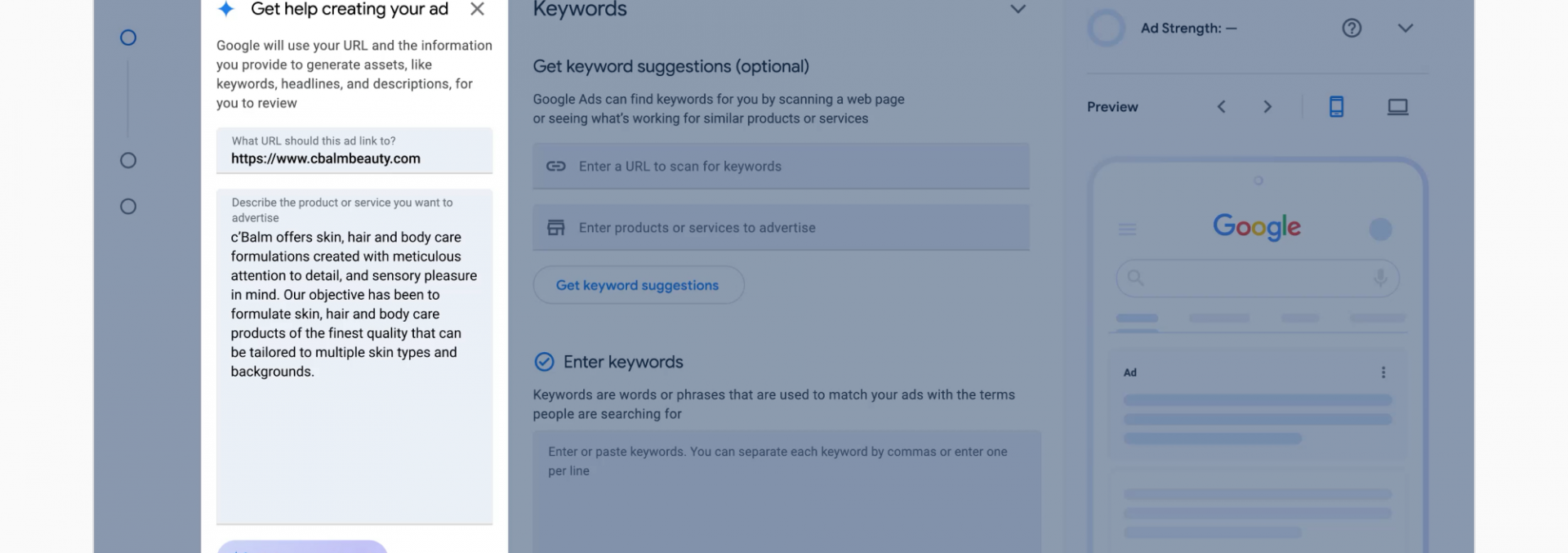 • Anúncios na Busca Aprimorados com IA: O Google também vai aprimorar a publicidade na Busca através de IA generativa, o que significa criar e adaptar anúncios em tempo real com base no contexto da pesquisa do usuário. Exemplo: se alguém digita “produto para pele seca e sensível”, a inteligência artificial usa conteúdo do site e também de anúncios existentes para criar um novo título para o anúncio: “Proteja sua pele sensível e ressecada”. A relevância a qualidade dos anúncios deve melhorar também para os usuários, seguindo a Experiência Generativa de Busca (SGE) que o Google anunciou recentemente durante o Google I/O.