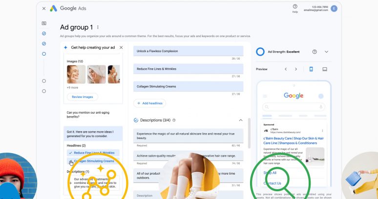 • Anúncios na Busca Aprimorados com IA: O Google também vai aprimorar a publicidade na Busca através de IA generativa, o que significa criar e adaptar anúncios em tempo real com base no contexto da pesquisa do usuário. Exemplo: se alguém digita “produto para pele seca e sensível”, a inteligência artificial usa conteúdo do site e também de anúncios existentes para criar um novo título para o anúncio: “Proteja sua pele sensível e ressecada”. A relevância a qualidade dos anúncios deve melhorar também para os usuários, seguindo a Experiência Generativa de Busca (SGE) que o Google anunciou recentemente durante o Google I/O.