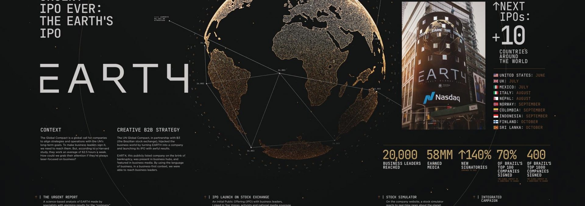 O projeto de lançar um IPO do planeta, “EART4”, criado pela AlmapBBDO para a B3 e o Pacto Global da ONU, venceu o Grand Prix da categoria Creative B2B em Cannes Lions 2023.