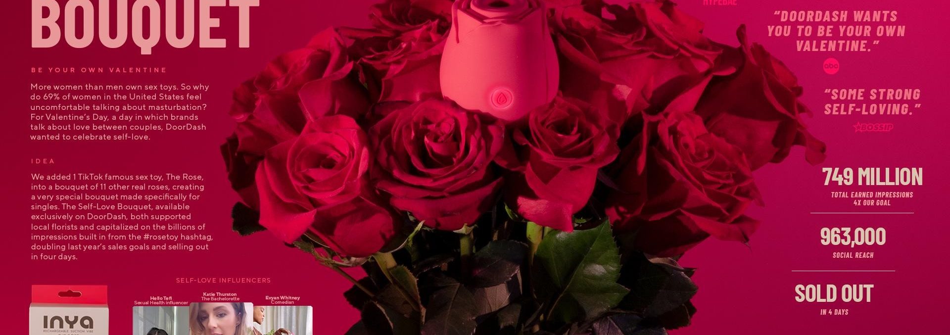 A DoorDash criou um buquê especial disponível exclusivamente através de seu serviço, composto por 11 rosas reais e um vibrador em forma de rosa, que é um dos brinquedos sexuais femininos mais vendidos e virais nos últimos cinco anos. A ideia era encorajar as mulheres a celebrar o amor-próprio e a auto-satisfação, desafiando o tabu em torno do prazer sexual feminino.
