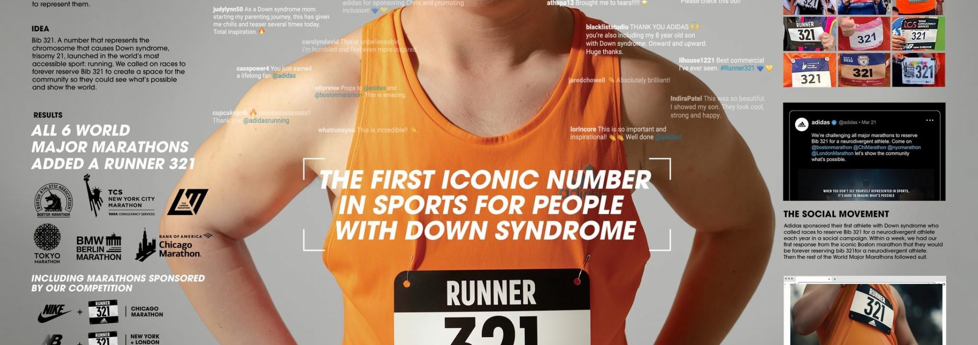A Adidas patrocinou Chris Nikic, o primeiro atleta com síndrome de Down a completar o Ironman. O objetivo da campanha era criar um movimento social para incluir atletas neurodivergentes nas principais maratonas do mundo, o que contou com a participação das principais concorrentes da Adidas.