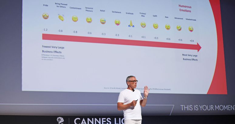 Apesar de ser uma ferramenta poderosa e eficaz, o humor está em declínio. É o que sugere Andrew Robertson, CEO da BBDO, com dados da Kantar sobre a produção de conteúdo nos últimos anos. Mesmo em Cannes Lions. Considerando os Grand Prix e Leões de Ouro em 2022, apenas uma 1 em cada 10 cases usou humor.
