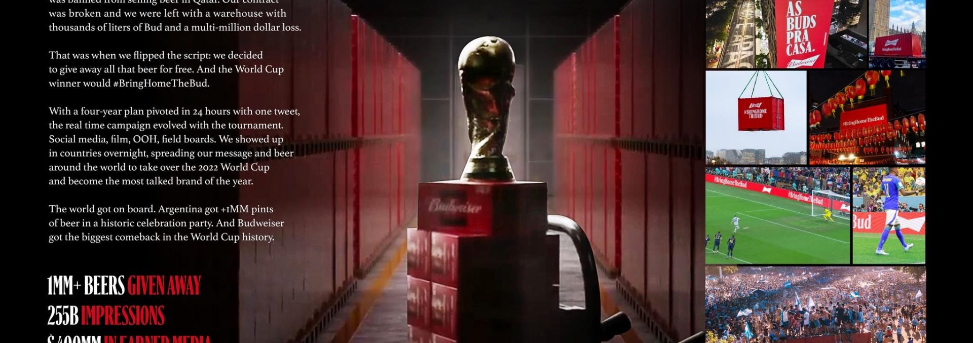 Essa foi uma bela ação de oportunidade que ficou mundialmente conhecida durante a Copa do Mundo no Catar. Aqui vemos uma junção muito interessante de out of home com redes sociais, criando praticamente um torneio paralelo entre amantes de futebol e cerveja para ver quem traria a Bud de volta para casa. Muito orgulho desse Titanium para o Brasil!