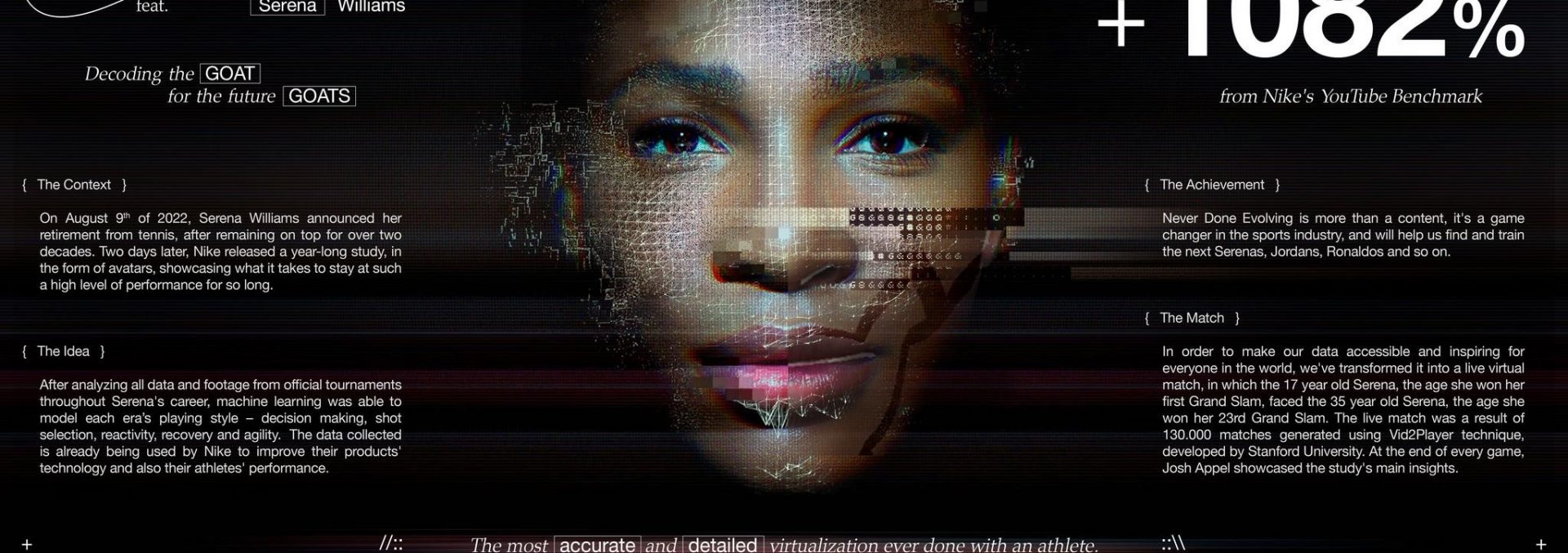 A tecnologia tem papel central nesse case da Nike. Com objetivo de manter viva a potência de uma lenda como Serena Williams, usaram inteligência artificial e machine learning para estudar e recriar os movimentos da tenista em um avatar. Forma lúdica e criativa para seguir inspirando futuras atletas.