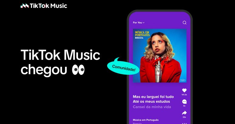 O TikTok Music pode ser acessado em music.tiktok.com ou através dos aplicativos para iOS ou Android.