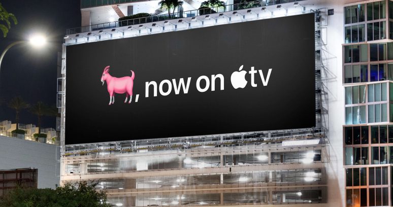 Utilizando o emoji de um bode rosa – que em inglês é goat e corresponde a sigla GOAT: Greatest Of All Time – o outdoor lembra que agora todos podem assistir ao craque argentino no Apple TV+. Rosa é a cor do uniforme do Inter Miami.