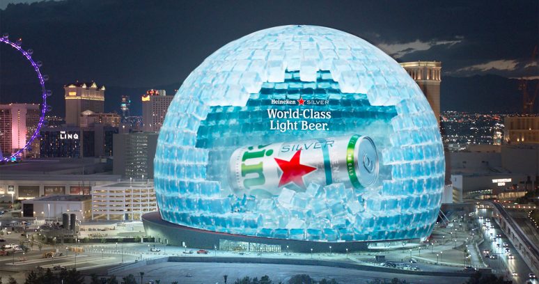 Heineken vai apostar alto na publicidade durante o Grand Prix de Fórmula 1 em Las Vegas, tornando-se a primeira cervejaria a anunciar na já icônica esfera que domina o horizonte da cidade. Como já se previa, a inovadora estrutura de US$ 2.3 bilhões é uma plataforma ideal de propaganda. Recentemente, a Coca-Cola também utilizou a Sphere para anunciar.