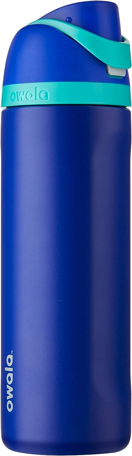 A garrafa térmica Owala de 709 ml é feita de aço inoxidável e possui um canudo conveniente para fácil consumo. Mantém bebidas frias por horas, perfeita para quem está sempre em movimento.