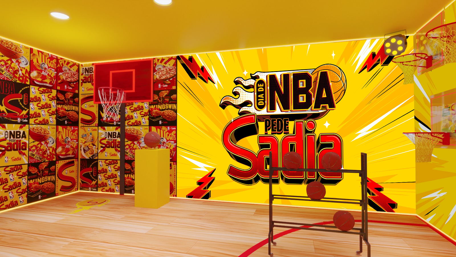 ↳ Sadia: Espaço para fotos simulando enterradas e o “Desafio 40 mil pontos”, homenageando grandes jogadores de basquete.