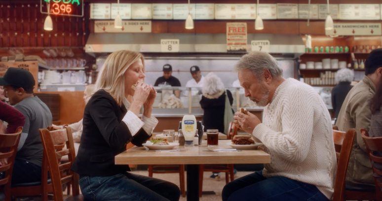 A Hellmann’s repete a alta aposta em celebridades em seu quinto ano consecutivo de Super Bowl: a marca recriou a icônica cena do delicatessen de “Harry e Sally: Feitos um para o Outro” (1989), reunindo Meg Ryan e Billy Crystal no mesmo Katz’s Deli do filme original.