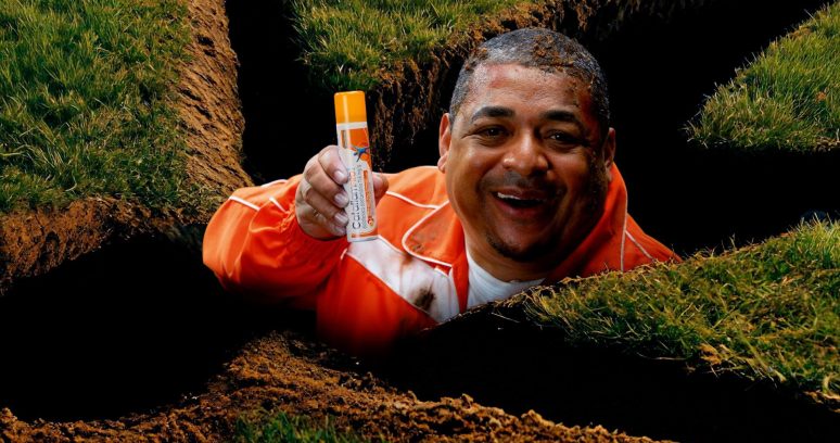 O filme da campanha mistura o ex-jogador Vampeta — que colecionou três rebaixamentos na carreira — com inteligência artificial para criar outros “personagens” que reforçam a mensagem. A escolha do Vampeta não é aleatória: quem melhor que alguém que já sentiu a dor da queda para falar sobre alívio?