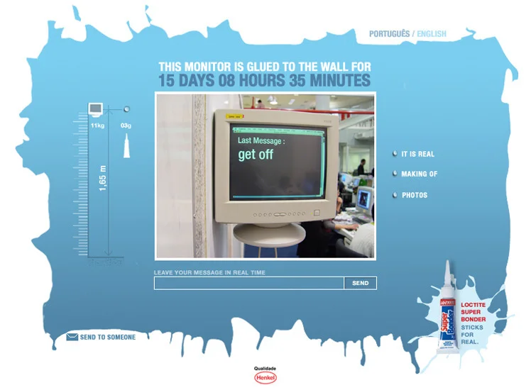 Em 2005, enquanto o mundo ainda tateava os limites da internet e o YouTube engatinhava, um monitor de 11 quilos apareceu colado de lado em uma parede. Ele transmitia mensagens em tempo real, 24 horas por dia. Sem cortes, sem truques. Era uma campanha de Super Bonder criada pela DM9DDB para a Henkel, num experimento radical para provar que a cola grudava pra valer, ao vivo, diante de qualquer cético que tivesse uma conexão com a web.