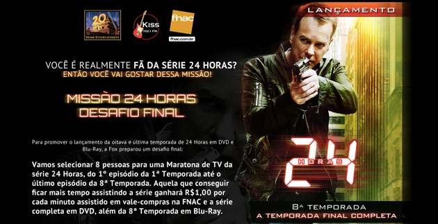 Agora a briga é séria. Guinness book+24 horas = tentativa de bater o recorde mundial de mais tempo assistindo TV sem interrupção. Na ação criada pela iChimps para a FOX, 8 participantes ficarão dentro da FNAC Pinheiros em São Paulo e tentarão assistir a todos os episódios das 8 temporadas de 24 horas para promover o lançamento da oitava e última temporada da série no Brasil.