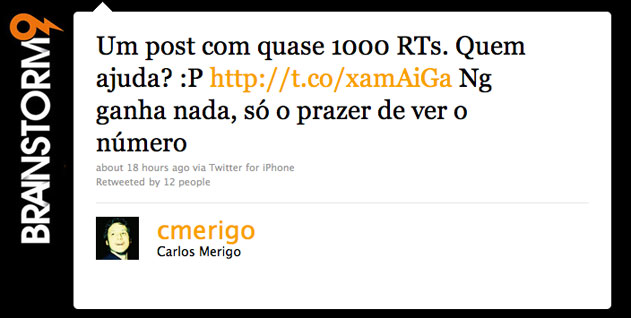 E medir RTs não parece as vezes como se fosse uma necessidade old media de tentar mostrar que estamos atingindo mais pessoas que a audiência inicial? Um racional próximo ao de dizer que cada jornal é lido por mais 4 pessoas? Nem sei se esse é o número correto mas e aí? É isso mesmo? Aumentar o valor e vender o espaço comercial mais caro. Até aqui no Brainstorm#9 nós fazemos isso. Acaba virando regra do mercado e as vezes só sobrevive quem segue essas regras que ninguém fala.