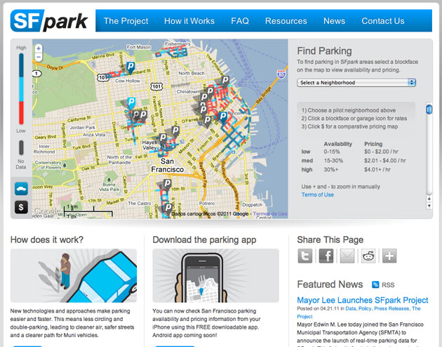 Chamado de SFpark, o projeto utiliza sensores para detectar vagas ocupadas, e através do site e do app para iPhone é possível ver lugares disponíveis e quanto custa. Isso porque o preço será calculado de acordo com a demanda, variando de 0.25 a 6 dólares por hora.