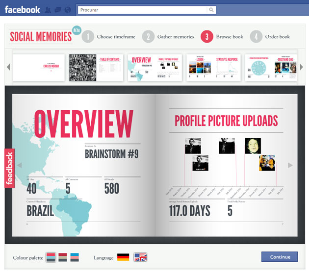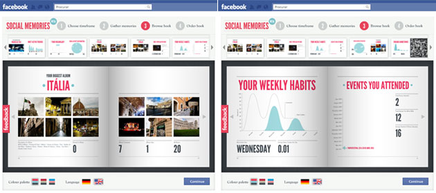 É uma ferramenta da Deutsche Post DHL, que cria elegantes infográficos de suas memórias e interações na rede social. E se quiser, pode receber o livro impresso com 28 páginas na sua casa, por 19 euros.