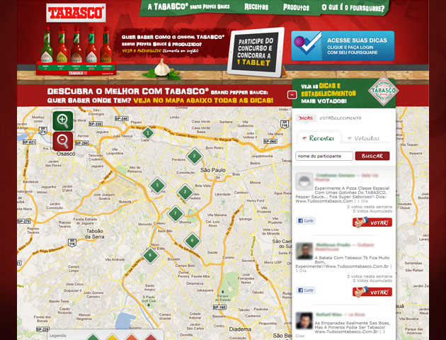 O Brasil é um dos países que mais ganha espaço no Foursquare, e a campanha é uma competição em tempo real por meio dessa rede social mobile, que conta com uma página exclusiva no site do Foursquare para oferecer aos usuários dicas de comidinhas e pratos que vão bem com Tabasco.