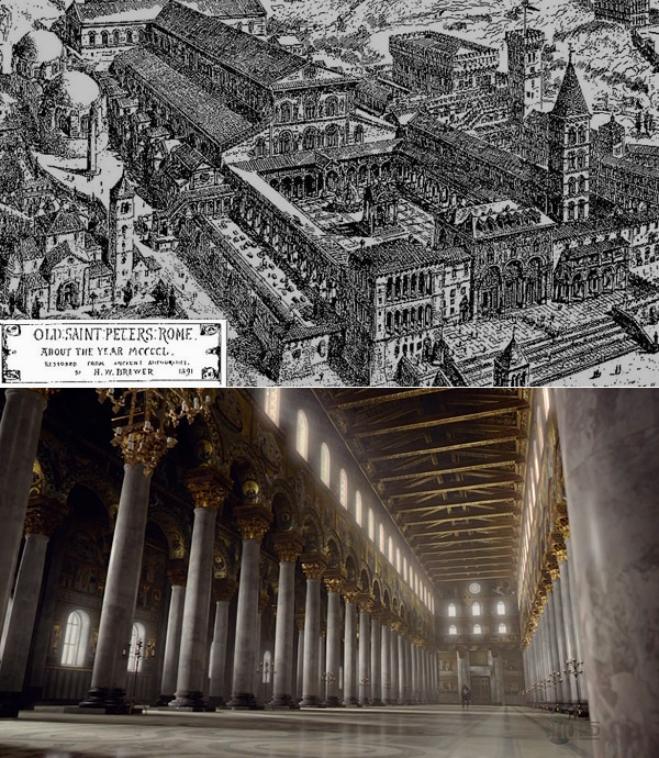 Outro ponto incrível vai para o set de filmagens e as recriações em computação gráfica de cenários que não existem mais: como a Antiga Basília de São Pedro. Reparem no desenho da época e na arte da série. Ao menos o telhado é bem fiel, não? :)
