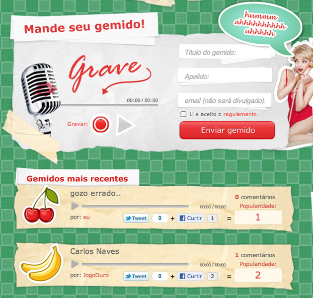 . A grosso modo (sem gozação), a iniciativa de um buscador de produtos eróticos propõe que os participantes gravem um gemido criativo e divulguem em redes sociais, com o objetivo de obter votos. Serão selecionados 10 gemidos, metade deles por voto popular.