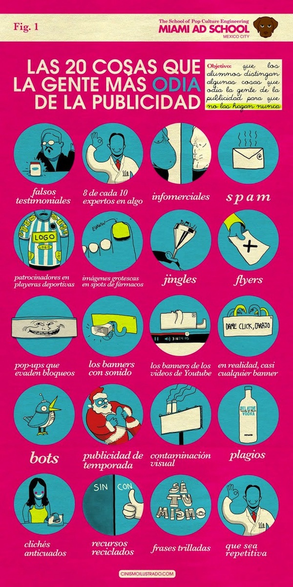 Certamente, em algum momento da sua vida, você já parou para pensar naquelas coisas que você mais ODEIA na publicidade. O genial Salles, do blog Cinismo Ilustrado, não só pensou como foi além e colocou no papel. Agora, convidado para integrar o corpo docente da Miami Ad School México – segundo ele, não para ensinar os alunos a venderem suas almas ao diabo ou as estratégias do mercado para manipular as pessoas, mas para mostrar a utilidade do desenho no momento da criação -, ele resolveu iniciar um novo exercício.