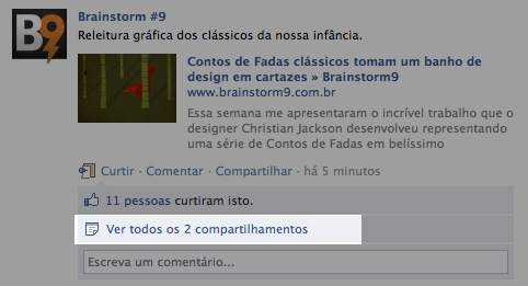 Outra novidade, é que cada item agora pode exibir os compartilhamentos, além dos cliques em “curtir”. Olha um exemplo da página do B9