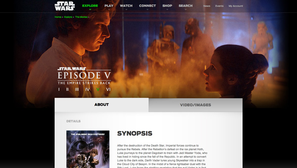 Pois hoje mordi a língua, já que a agência Big Spaceship apresentou o novo StarWars.com. Agora bem mais organizado – dividido em seções como Explore, Play, Watch, entre outras – o site conta com uma navegação primordialmente visual.