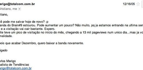 Carlos Merigo, em 2005, torcendo pro site não ter muita visitação porque o ganancioso do provedor de hospedagem cobrava um absurdo pela transferência de dadosQuando o B9 nasceu eu era um programador perdido nos cafundós do mundo, no meio da crise dos 30 anos, sem saber muito para onde ir. Mais ou menos como a comunicação digital na época. Hoje continuo sem saber pra onde ir, mas mudei de carreira, de país, trabalho em uma das maiores agências do Brasil e tenho a felicidade de chamar de amigo vários dos principais nomes da nossa profissão, incluindo todos esses outros caras que estão escrevendo textos de retrospectiva por aqui e, principalmente, esse figura chamado Carlos Merigo, que pessoalmente é tudo isso que vocês acham que é: um cara amigão, 100% do bem que é feliz fazendo aquilo que gosta. Um cara que foi dormir no sofá pra eu dormir na cama num passado distante onde a gente rodava São Paulo buscando oportunidades de expandir o universo do B9.