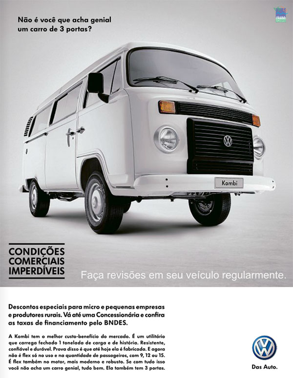 Inspirada por uma piada já recorrente sobre o Veloster da Hyundai, a Volkswagen veiculou ontem nos principais jornais um anúncio da Kombi.