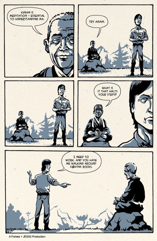 Não importa se é em Hollywood, em histórias mitológicas, na literatura ou nas produções da Disney: o conceito da Jornada do Herói está sempre lá. Os 12 passos traçados por Joseph Campbell podem ser reconhecidos nas mais diferentes histórias. Inclusive na de Steve Jobs. Muita viagem? É, pode ser. Mas foi o encontro com o mentor – 4o. passo da Jornada do Herói – que serviu de inspiração para The Zen of Steve Jobs, uma graphic novel produzida pela Forbes em parceria com a JESS3.