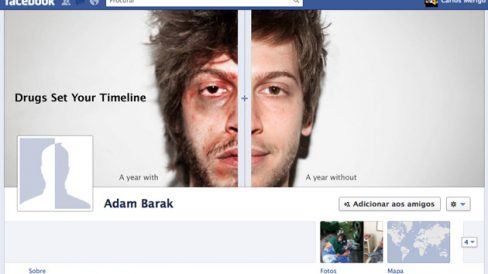 Dividido em duas colunas, onde cada uma representa um ano na vida do fictício Adam Barak, o perfil mostra um cotidiano com drogas e outro sem. A execução não para na foto de capa, rola lá: facebook.com/Antidrugstimeline