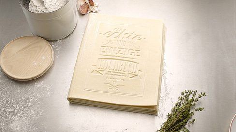 É um livro de receitas onde as páginas são feitas de massa fresca. Funciona assim: você segue as instruções, vai acrescentando os ingredientes, leva ao forno e pronto.