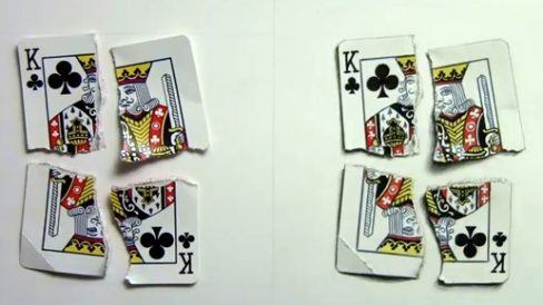 Na sua série de desafios de realismo, o ilustrador Mark Crilley desenha uma carta de baralho rasgada em quatro partes.