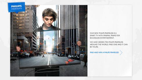 Para promover a linha de TV’s Frameless, que praticamente não tem borda, a marca escondeu 10 unidades ao redor do mundo. O site philips-hideouts.com mostra uma imagem de cada local, que funcionam como pistas. Utilizando o Google Maps o participante deve então marcar no mapa onde ele acha que está a TV. Aquele que chegar mais perto leva.