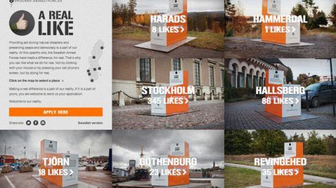 A DDB de Estocolmo criou “estações” físicas de like, e as espalhou sete lugares da Suécia em que o exército local já fez diferença. Qualquer pessoa pode apertar o botão nessas caixas e dar like, mas claro, é preciso sair de casa.
