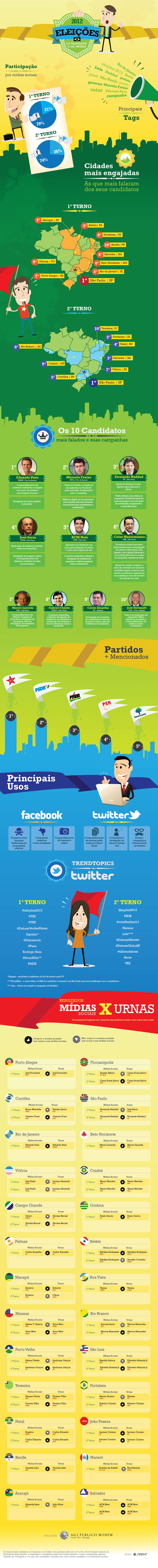 Criado pela AG2, esse infográfico reúne a repercussão das eleições municipais de 2012 nas mídias sociais. O monitoramento foi feito durante o fim de semana do primeiro turno – entre 5 e 7 de outubro – e também do segundo turno – entre 26 e 28 de outubro.