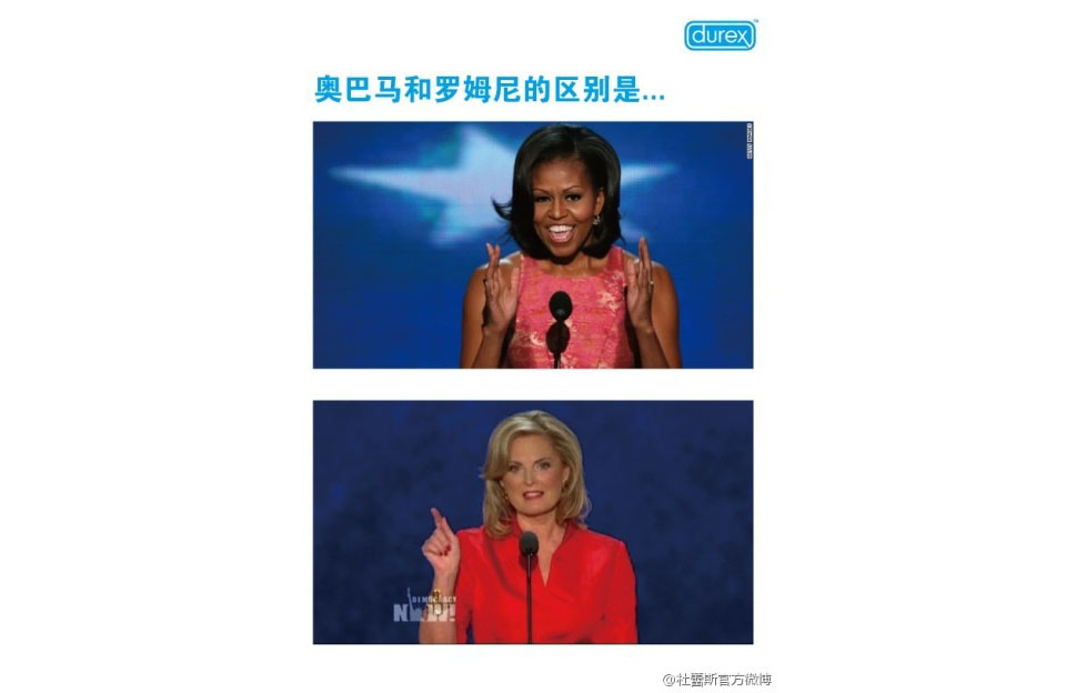 Barack Obama foi reeleito presidente dos Estados Unidos e, de quebra, tirou de Justin Bieber o recorde de retuites. Com a vitória confirmada, já estão aparecendo inúmeros anúncios de oportunidade, mas talvez o melhor deles seja o feito pela marca de camisinhas Durex, na China. Publicada no Sina Weibo, um microblog chinês, a peça mostra uma sorridente primeira-dama com as duas mãos separadas, como se estivesse medindo algo.