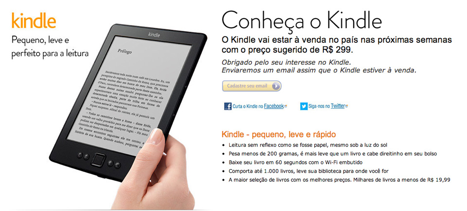 O Kindle que será vendido no Brasil ainda não está disponível. A Amazon promete para as promessas semanas, e no momento pede para os interessados cadastrarem seus emails para serem avisados. Porém, a própria loja destaca os aplicativos Kindle para outros dispositivos, para aqueles que não quiserem esperar.