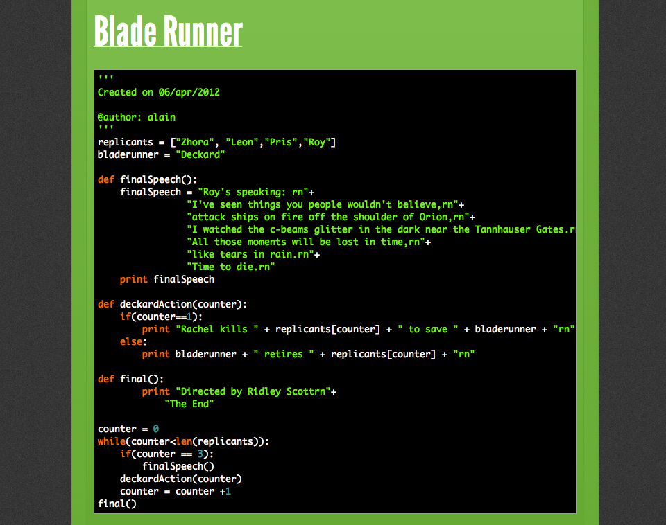 Parece loucura, mas na verdade é uma sacada muito divertida. Ben Howdle, um bem-humorado programador, resolveu criar um Tumblr para “traduzir” clássicos do cinema (ou não) para a linguagem de programação. Movies As Code já conta com alguns colaboradores, mas os leitores também podem enviar sugestões.